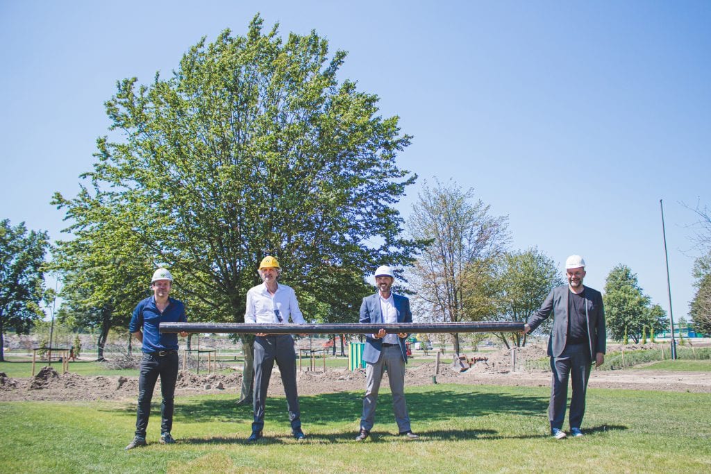 Op het terrein van de wereldtuinbouwtentoonstelling Floriade is gestart met de aanleg van een duurzaam warmte en koude opslagsysteem in de vorm van een Smart Thermal Grid. De samenwerkingsovereenkomst hiervoor is onlangs ondertekend door ontwikkelcombinatie Amvest-Dura Vermeer (OCAD) en Eteck, exploitant van duurzame warmte. In de komende maanden zal dit Smart Thermal Grid (STG) gerealiseerd worden. Vanwege het bijzondere, innovatieve karakter van het STG heeft wethouder Jan Hoek het startsein van de werkzaamheden gegeven. Samen met de partners namen zij ‘de leiding’.